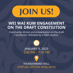 On Thursday, January 9 we’re hosting a community dinner and presentation to explore the Wei Wai Kum draft Constitution. This is a chance for you to learn more about the purpose of a constitution, what it means for Wei Wai Kum, ask questions and share your thoughts!