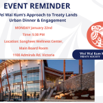 We would like to extend a warm invitation to join us at the Wei Wai Kum Treaty Lands Presentation and Dinner on January 22nd in Victoria at the Songhees Centre. This event is open to all members of the Wei Wai Kum community, and we would be honoured to have you there. Gila’kasla